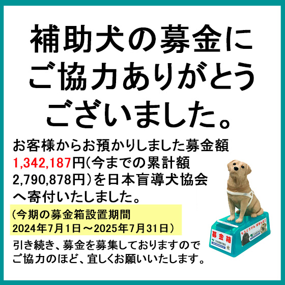 子育て応援支援や、盲導犬募金箱の設置、災害義援金などの社会貢献と共に健康で働きやすい職場環境をめざし取り組んでいます。