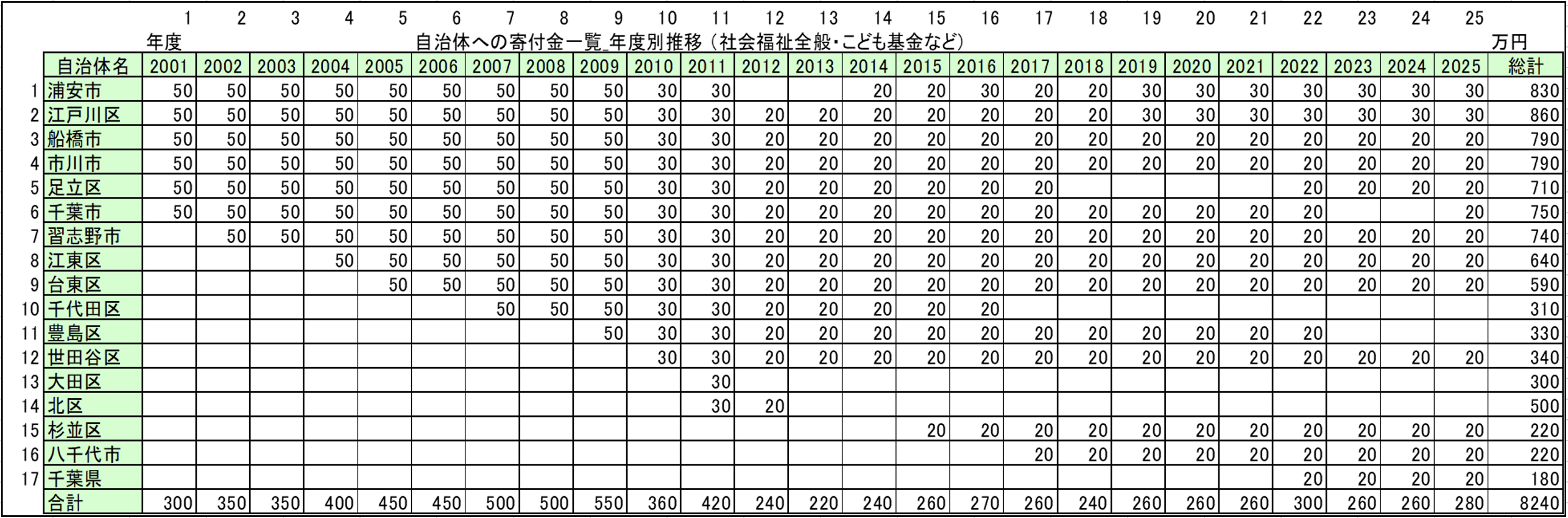 地域自治体への寄付活動はワイズマートへ社名変更した2001年から継続しています。 1市区当たりの寄付額は20万円と些少ですが、「継続は力なり」を旨としています。「健やかなる時も病める時も変わらぬ姿勢で寄付を続ける・・・」気が付けば、四半世紀で8240万円の額となりました。