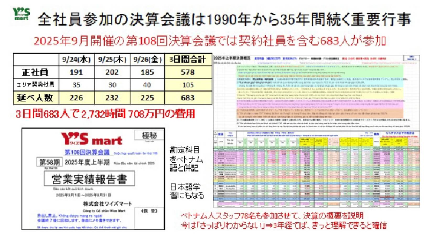 大学で経営学を学んでいなくても、「自分の商いの数字」は興味も関心も湧き、自発的に学ぼうとする意欲が高まります。気が付けば「減価償却費」の意味を知り、設備投資や教育投資がいかに費用化されていくのかを体感することになります。2025年9月からベトナム人実習生・特定技能性にも会議に参加させています。「何の事だかさっぱりわからない」そんな彼ら彼女らも、3年後には「自分の商いの数字を語れる」人になっていると信じています。