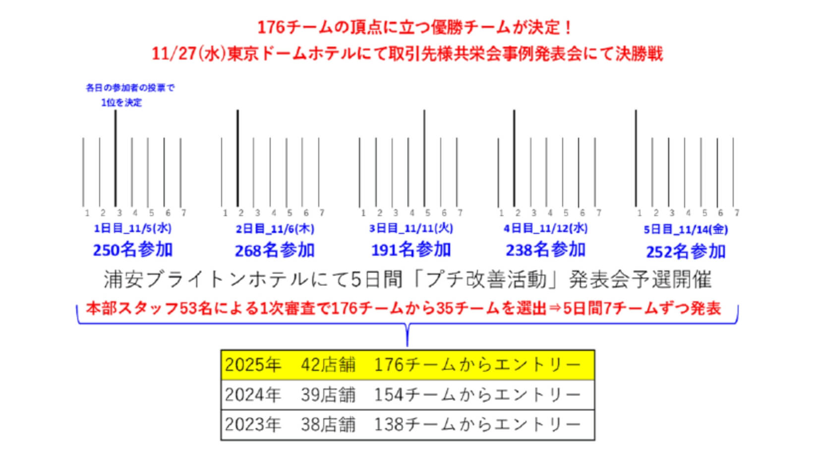 2025年度は、176件の活動報告から1次審査を通過した35チームが5日間の日程で予選を行い、パート社員さんらの投票で1位を決定。それぞれの日の1位チームが6チーム(2日目は同率1位が2チーム)集まり、11月27日に東京ドームホテルで決勝戦が行われました。
