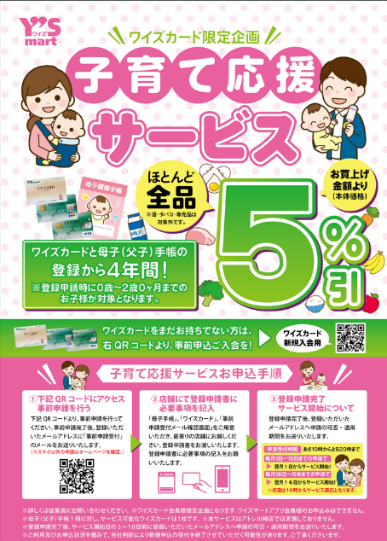 このような背景をもつ当社が子育て世代へのより手厚く、直接的な支援として提供を開始したサービスが「子育て応援サービス」です。概要は次の通りです。0~2歳0か月までのお子様がいらっしゃるお客様を対象に、登録から4年間、全商品(酒やタバコは除く)が無条件で5%引きになるサービスです。
