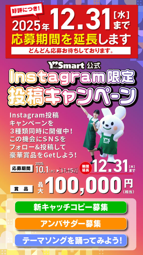 ワイズマート創業50周年を記念して、公式Instagram(ysmart_fan)では、楽しい3つの投稿企画を開催中!
