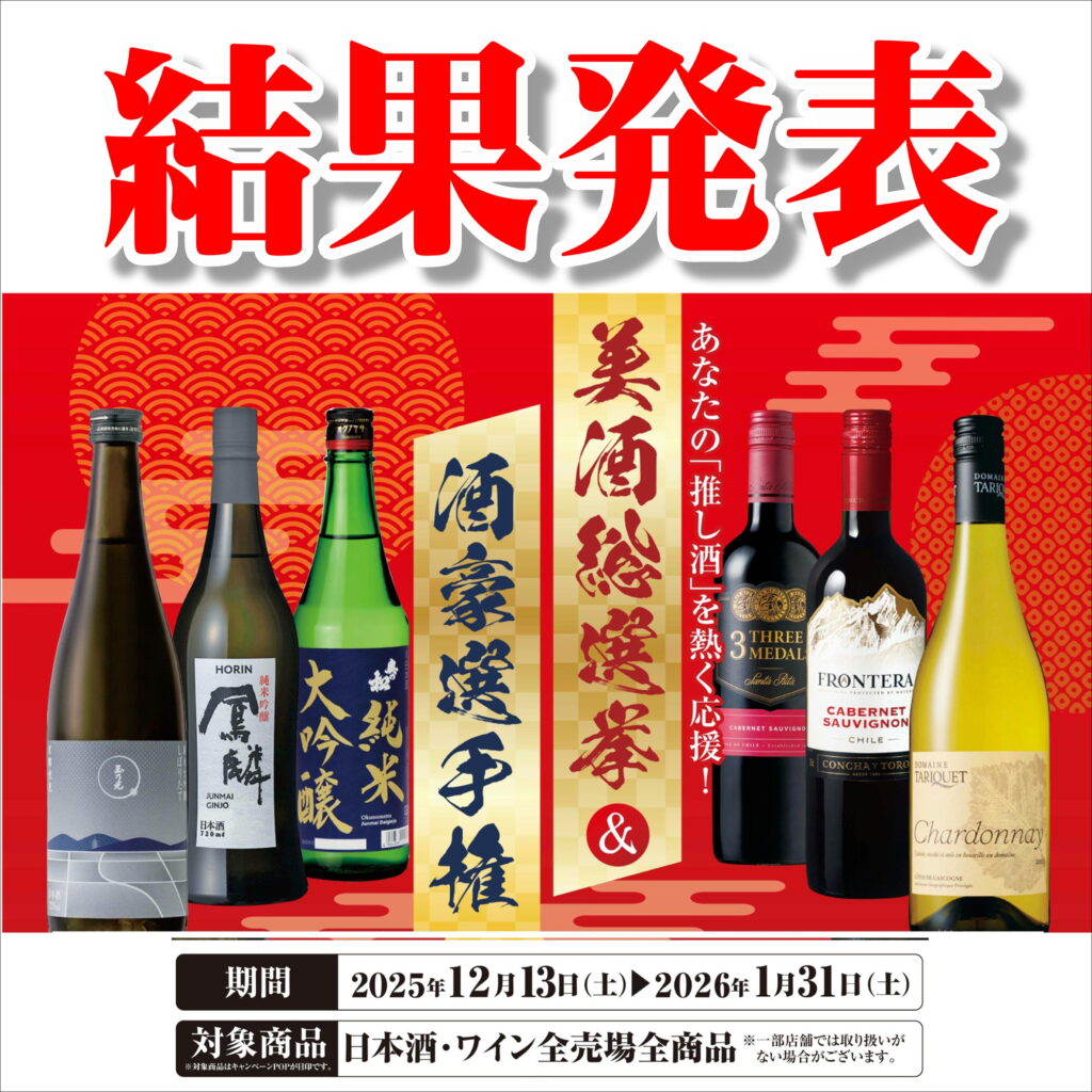 ワイズマートでは年末年始を盛り上げるためお酒(日本酒・ワイン)の総選挙をおこないました。皆さまの一票(期間中:2025/12/13~2026/1/31の販売金額)でワイン・日本酒トップ10と 酒豪ランキングが決定いたしましたのでここに結果を発表致します。