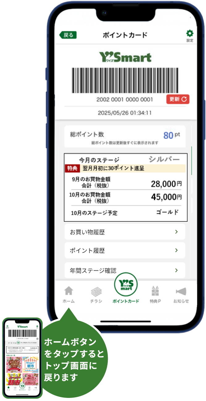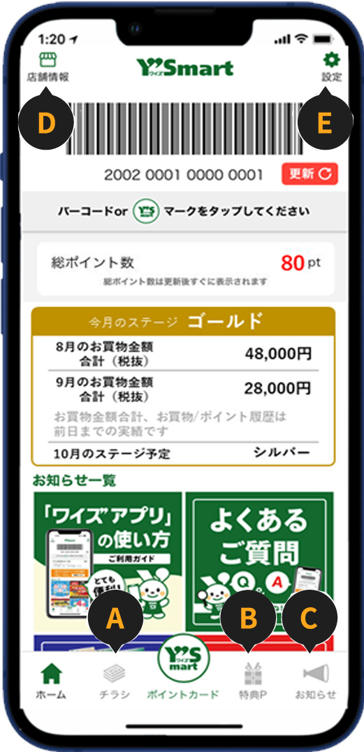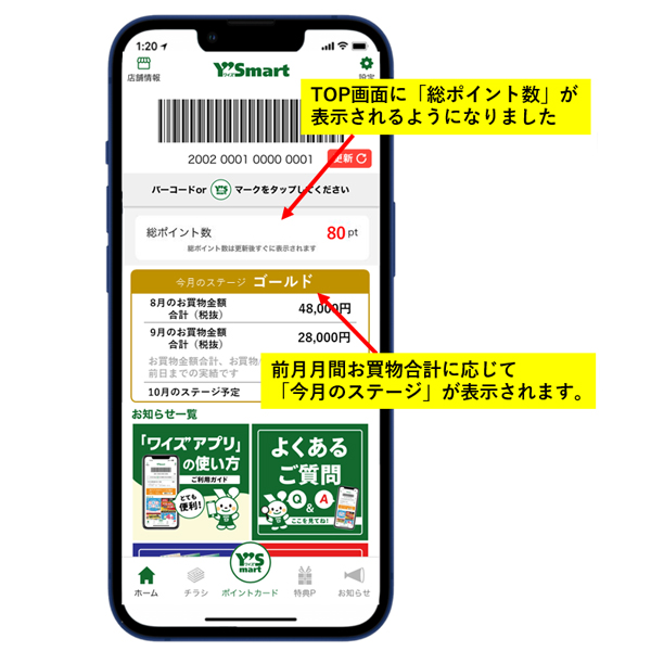 また、ポイントカード画面に表示される「総ポイント数」、「今月のお買物金額」、「お買物履歴」、「ポイント履歴」についても、下の表にまとめてありますので、ご確認下さい。