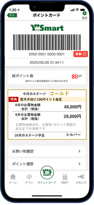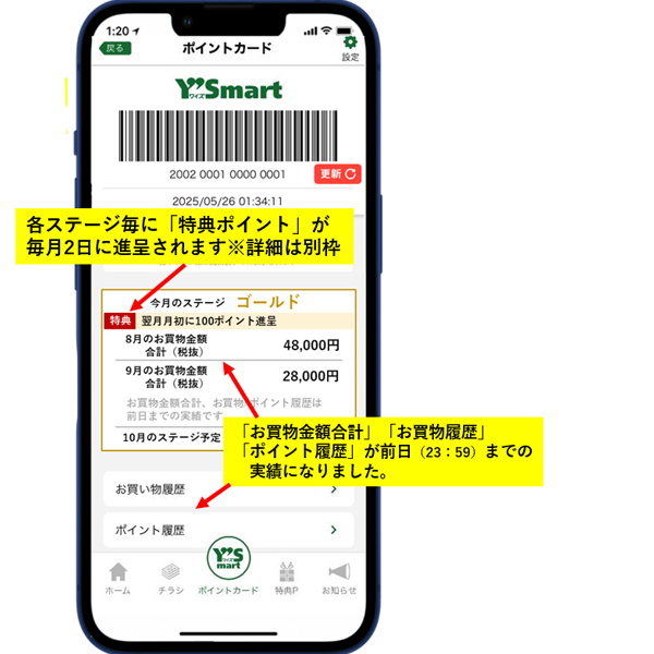 大まかにまとめると「総ポイント数」は、お買物とほぼ同時に反映されます。しかし、他の3項目(今月のお買物金額、お買物履歴、ポイント履歴)につきましては、お買物が午前の時は翌日に反映され、午後の時には、翌々日に反映されます。これは、レジ毎に精算という締め処理を行っているためで、精算後のお買物は、翌日分としてレジで処理されるためです。反映は後日になりますが、お買い物の日付は正しく反映されますので、ご安心下さいませ。