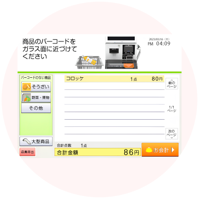 全ての商品のスキャンが終わりましたら、レジ画面右下の「お会計」ボタンをタップします。