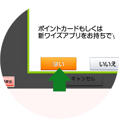 お会計後、「ポイントカード、もしくはワイズアプリをお持ちですか?」の確認画面が表示されたら、「はい」を押します。