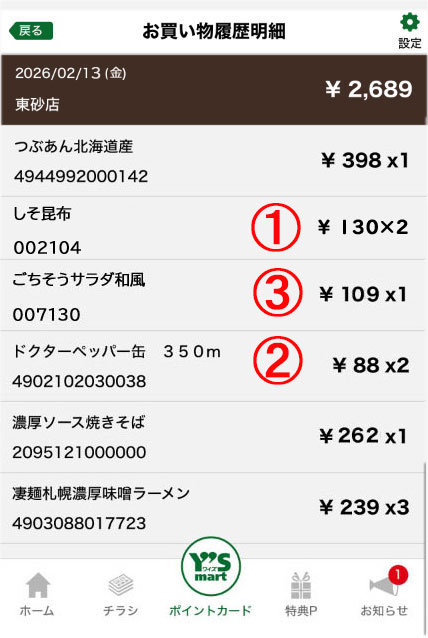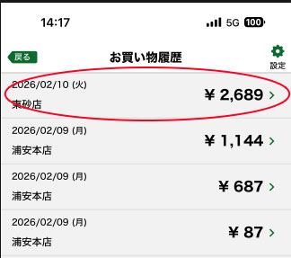 • お買い物履歴をタップします。※お買い物の反映タイミングは、午前中購買分は翌日朝6時。午後購買分は翌々日朝6時となります。