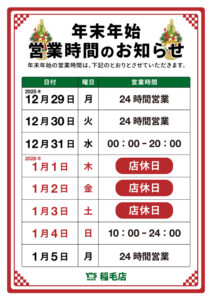 | 営業時間 | 24時間営業 ※一時お休みさせていただく場合もございますので、予めご了承ください。 広告特売は10時から21時までとなります。 21時から翌日10時までは広告の価格と異なる場合がございます。 ホームページからのお問い合わせは、こちらから |