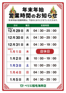 | 営業時間 | 4:30~25:00 ※一時お休みさせていただく場合もございますので、予めご了承ください。 広告特売は10時から21時までとなります。 21時から翌日10時までは広告の価格と異なる場合がございます。 ホームページからのお問い合わせは、こちらから |